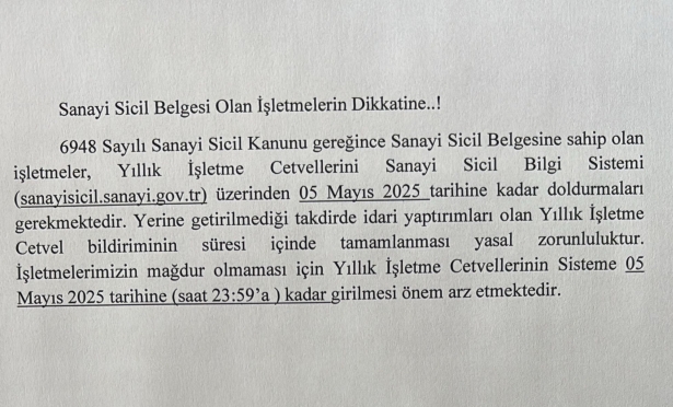 6948 Sayılı Sanayi Sicil Kanunu kapsamında Sanayi Sicil Belgesine sahip olan iÅŸletmelerin 30 Nisan 2025 tarihine kadar Sanayi Sicil Bilgi Sistemindeki Yıllık İşletme Cetveli doldurma iÅŸlemleri ile ilgili süre 05 Mayıs 2025 tarihine (saat: 23.59'a) uzatılmıştır.