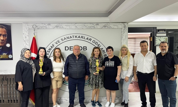 "Denizli'nin Parlayan Yıldızları" yarışmasında türban kategorisi birincisi Nurcan Kösehan ve Makyaj kategorisinde üçüncü olan Sevim Alkış Denizli Esnaf ve Sanatkarlar Odaları BirliÄŸi BaÅŸkanımız Mehmet Ali ErbeÄŸi'ni ziyaret etti. Ziyarete yarışma tertip sorumlusu Feriha Dayıbaşı, DESOB Yönetim Kurulu üyesi Neriman Ceylan Sarısoy katıldı. Dereceye giren Denizlili esnaflarımızı tebrik eder baÅŸarılarının devamını dileriz .